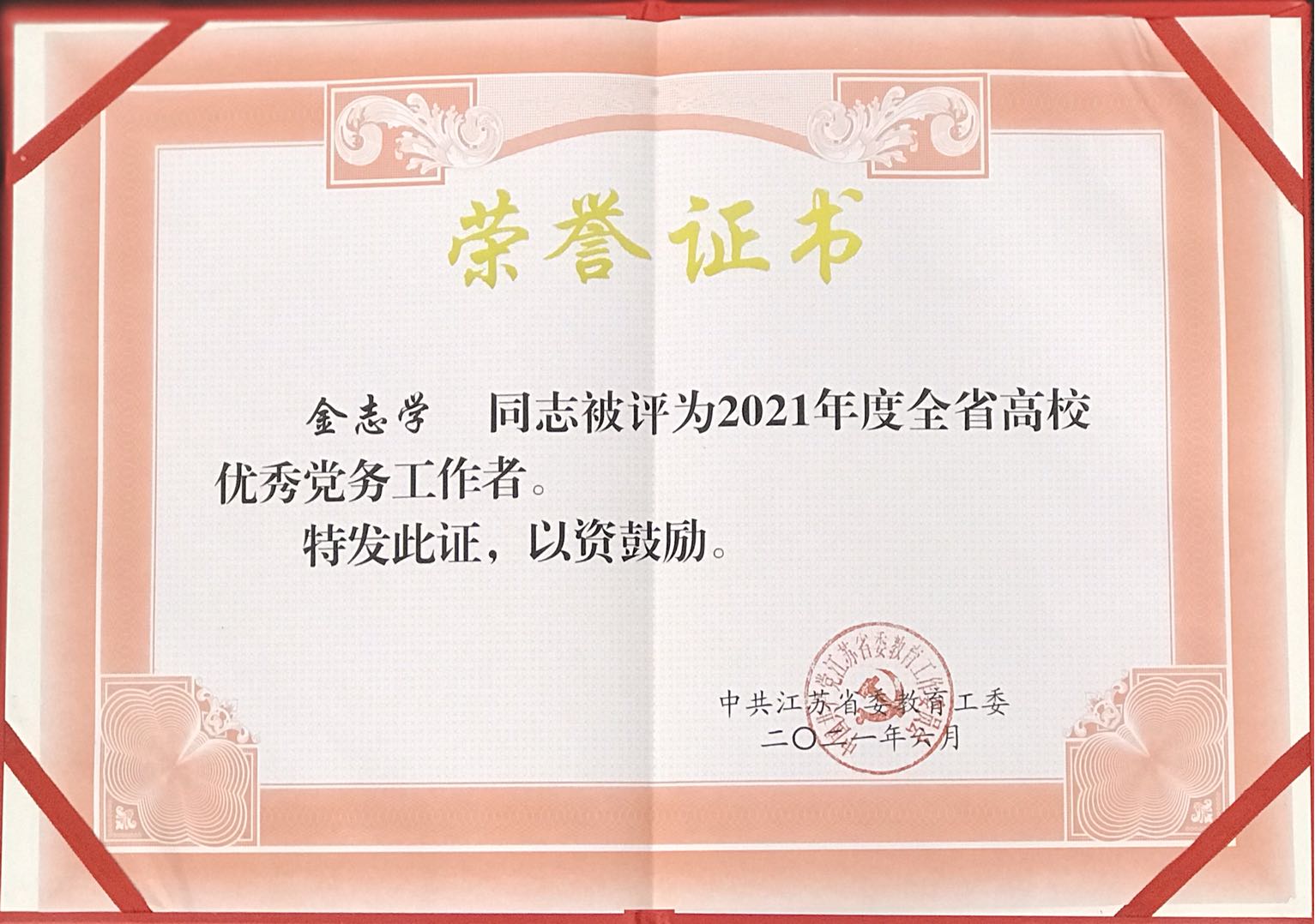 在庆祝建党100周年之际,中共江苏省委教育工委颁发“两优一先”表彰决定(苏委教组【2021】25号)。我院建筑工程与艺术设计学院党总支书记金志学同志荣获“2021年度江苏省高校优秀党务工作者”称号。