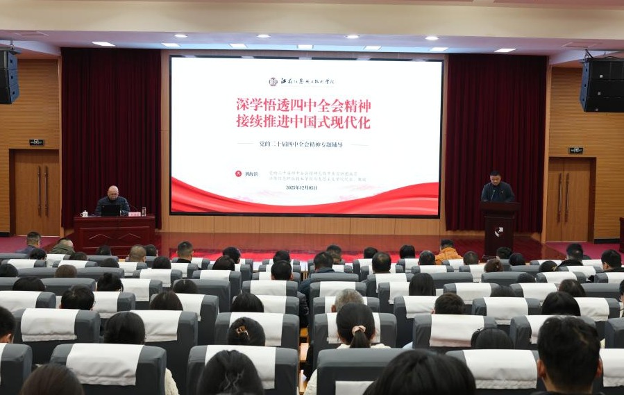 根据市委统一部署,12月5日下午,学习贯彻党的二十届四中全会精神市委宣讲团报告会在博学楼报告厅举行。市委宣讲团成员、江苏信息职业技术学院马克思主义学院院长刘海滨教授作宣讲报告。校领导与全体教职员、52期入党积极分子培训班学员代表到场聆听。党委副书记、副校长于吉伟主持报告会。