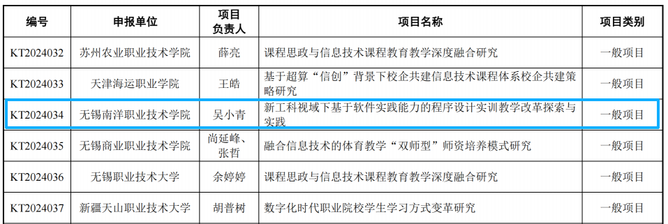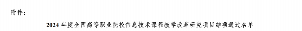 近日,教育部职业院校信息化教学指导委员会正式公布2024年度全国高等职业院校信息技术课程教学改革研究项目结项名单。经项目负责人提交材料、专家严格评审及教指委复核批准,本年度共有227项课题顺利通过结项评审,其中重大项目3项、重点项目10项、一般资助项目29项、一般自筹项目185项。我校吴小青老师主持申报的《新工科视域下基于软件实践能力的程序设计实训教学改革探索与实践》(项目编号:KT2024034)成功入选结项名单,顺利通过评审。